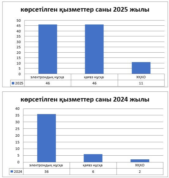 электрондық нұсқада көрсетілген мемлекеттік қызметтер саны- 36 қызмет қағаз нұсқада көрсетілген мемлекеттік қызметтер саны – 6 қызмет.
