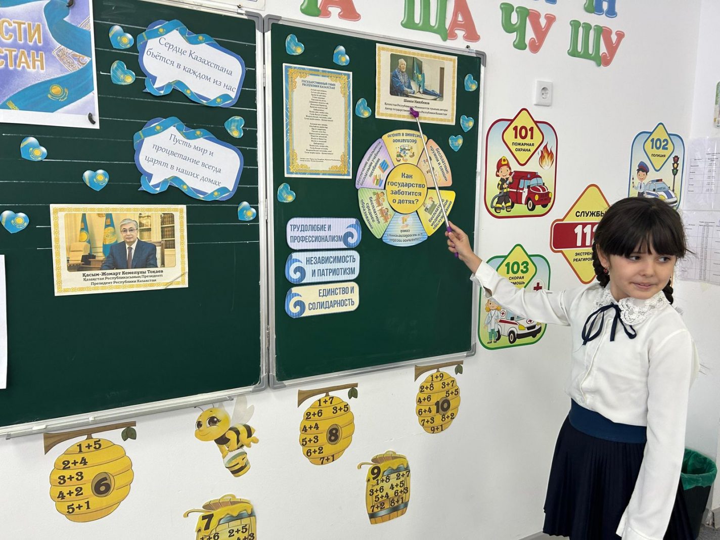 Арнайы назар оқушыларда патриоттық сезімді, мемлекеттік символдарға, ұлттық құндылықтар мен Қазақстан жетістіктеріне құрметті тәрбиелеуге аударылды. Балалар белсенді түрде диалогтарға қатысып, өз ойларымен бөлісті және ел болашағына жеке жауапкершіліктің маңызын түсінді.